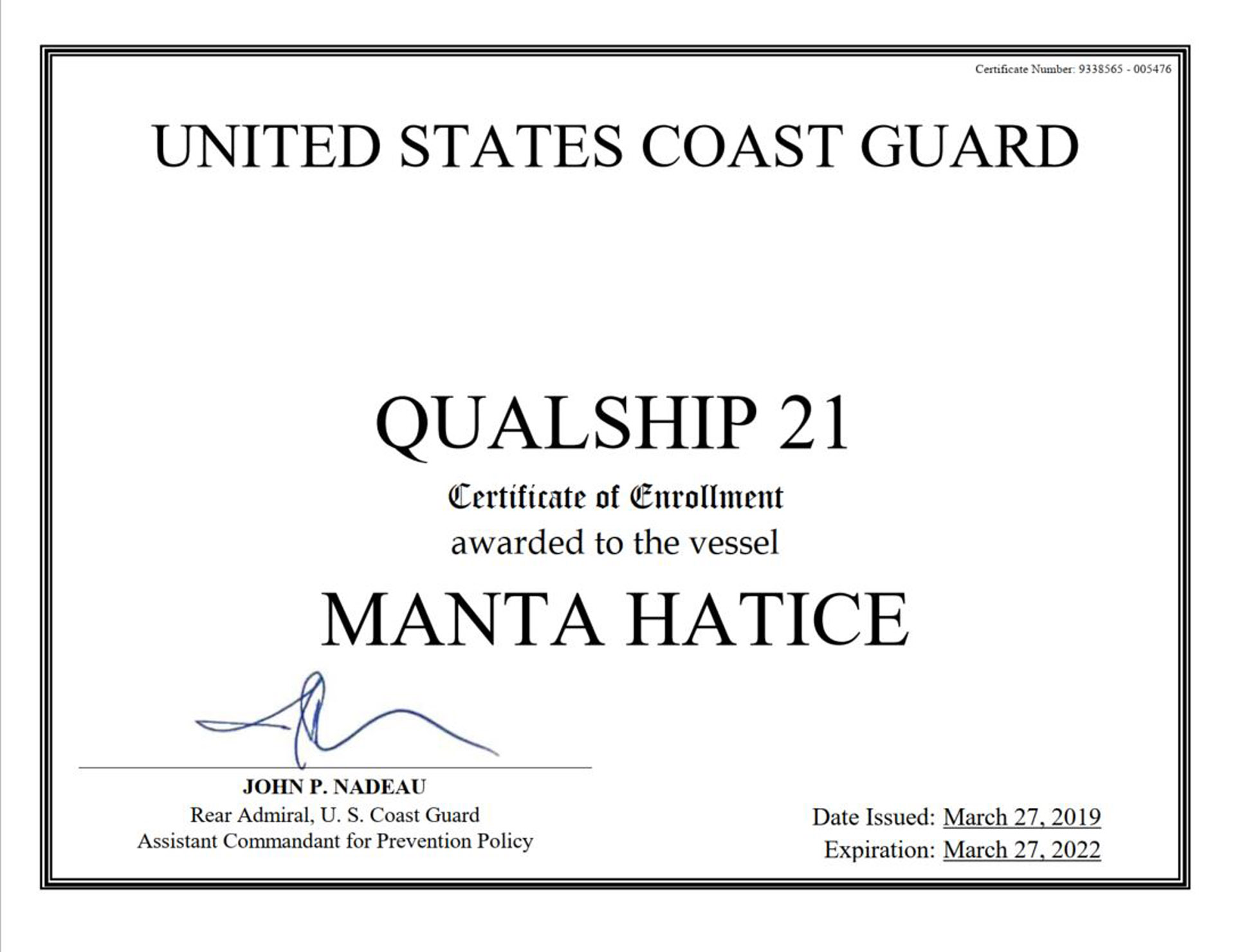Mv Manta Hatice is awarded with QUALSHIP 21 certificate by USCG upon successful completion of PSC inspection at Morehead City, NC since she meets all other applicable requirements of QUALSHIP 21 program. This is second vessel in Manta fleet which to show this success after Mv Binnur C.